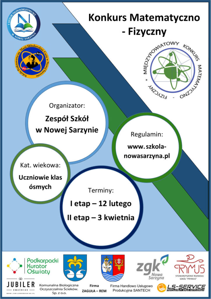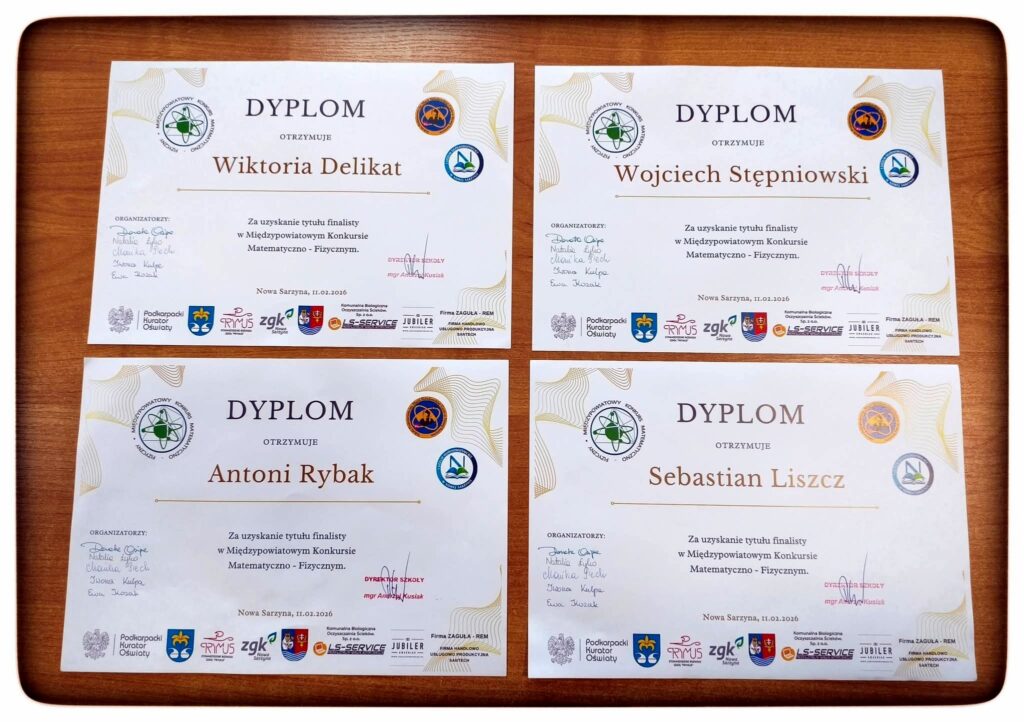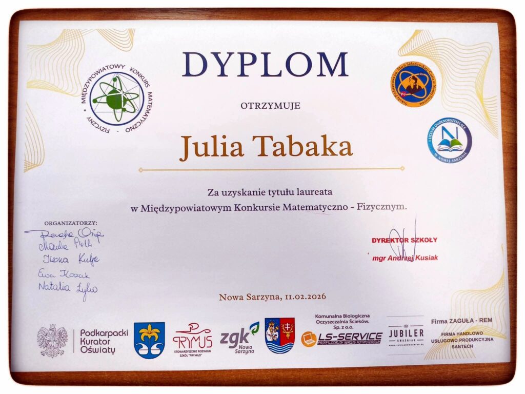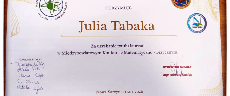 W dniu 11 lutego 2026 pięcioro uczniów z klas ósmych brało udział w Międzypowiatowym Konkursie Matematyczno-Fizycznym. 29 uczniów z różnych powiatów rozwiązywało 16 zadań w ciągu 60 min. W tym 12 zadań zamkniętych oraz cztery otwarte. W zestawie było 8 zadań z matematyki oraz 8 z fizyki, zadania były na wysokim poziomie. Wśród naszych uczniów mamy Laureatkę oraz czworo finalistów. Gratulujemy uczniom wspaniałych wyników.