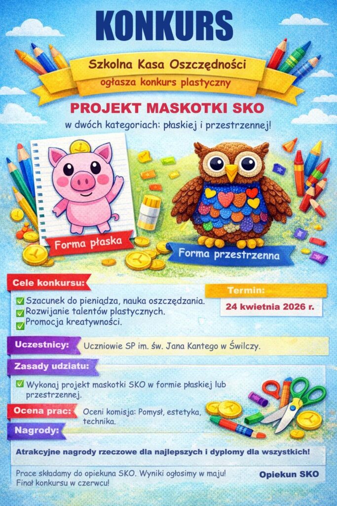Szkolna Kasa Oszczędności ogłasza konkurs plastyczny na wykonanie projektu maskotki organizacji w dwóch kategoriach: płaskiej i przestrzennej.